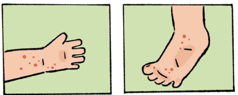 手、足等部位出现凸起的斑丘疹或疱疹,一般不痒。